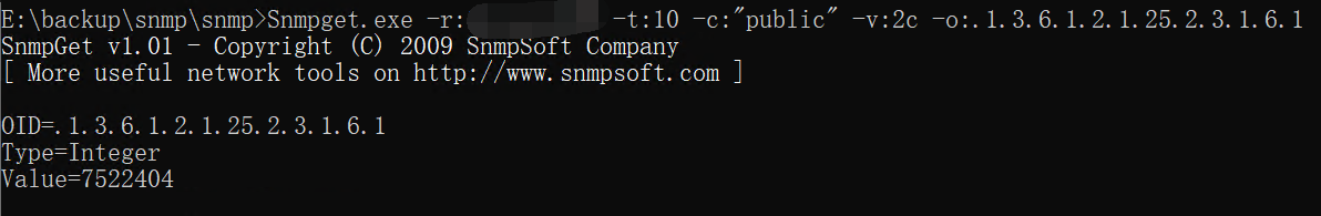 第二行 Snmpget.exe -r:r:ipaddr -t:10 -c:"public" -v:2c -o:.1.3.6.1.2.1.25.2.3.1.6.1 可以查询到具体的参数